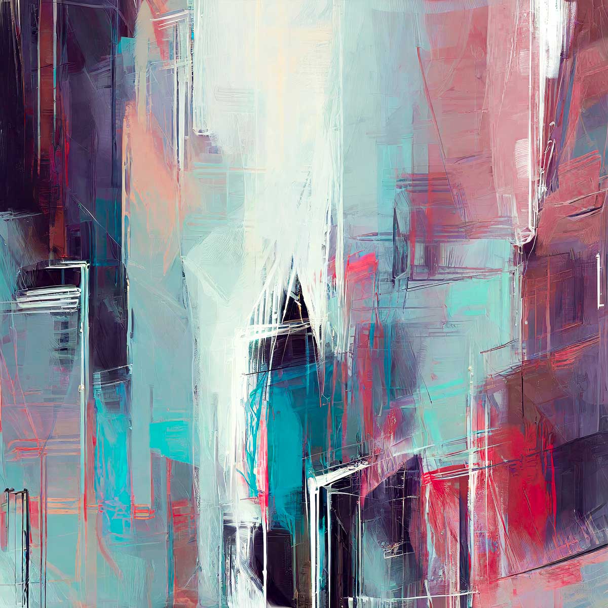Farvepaletten bevæger sig mellem akvamarin, lys turkis og kold mintgrøn, som glider over i perlehvid og elfenbenshvid i billedets midte. Langs siderne ligger dybere toner i aubergine, støvet bordeauxlilla og mørk blommeviolet, mens varme felter i fersken, koralrosa og dæmpet karminrød tilfører kontrast. Overgangene mellem de lyse og mørke zoner er bløde, men de mørke kantfelter giver motivet tydelig dybde og en markant rumlig spænding.