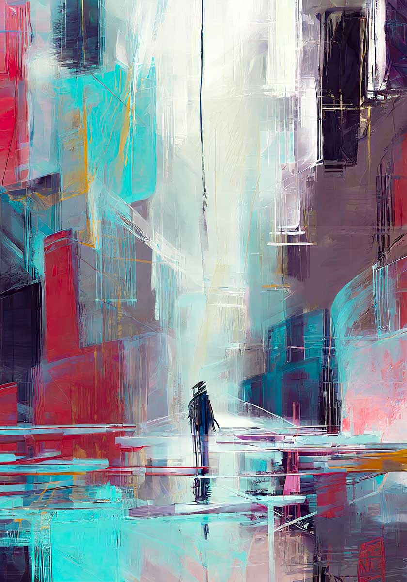 Moderne unik plakat viser et abstrakt motiv opbygget af lange diagonale linjer og brede penselstrøg, der krydser hinanden i en kompleks komposition. De skrå former skaber en tydelig retning gennem billedet og giver motivet en næsten arkitektonisk struktur. Lag af maling ligger oven på hinanden og skaber en dybde, hvor nye former gradvist træder frem.