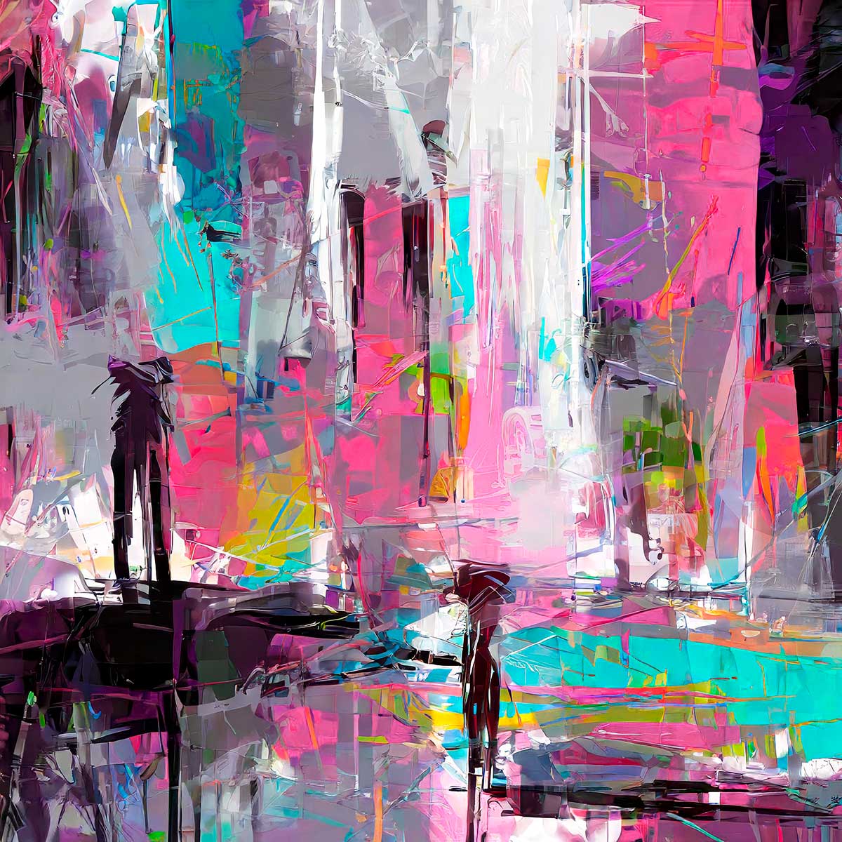 Farvepaletten er præget af lys turkis, mintgrøn og akvamarin kombineret med bløde områder i rosa, lyserød og magenta. Felter i lys grå, perlegrå og hvid giver motivet lys og balance, mens enkelte partier i okkergul og koralrød skaber kontrast. Samspillet mellem de lyse og mættede farver giver billedet et livligt, men stadig afbalanceret udtryk.