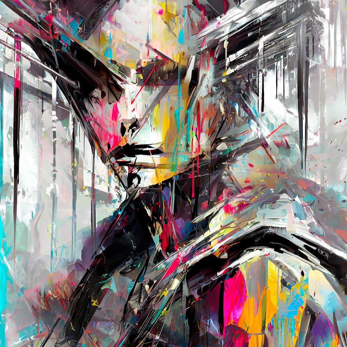 Farvepaletten samler kridthvid, lysegrå og stålgrå med markante accenter i citrongul, neonpink, karminrød og lys cyan. Mørke felter i kulsort, grafit og blæksort skaber stærk kontrast og understøtter de mere lysende farver, mens små områder i akvamarin og varm koral tilfører ekstra bevægelse. Kombinationen af de næsten monokrome grå partier og de mættede accentfarver giver værket en rå og meget præcis visuel energi.