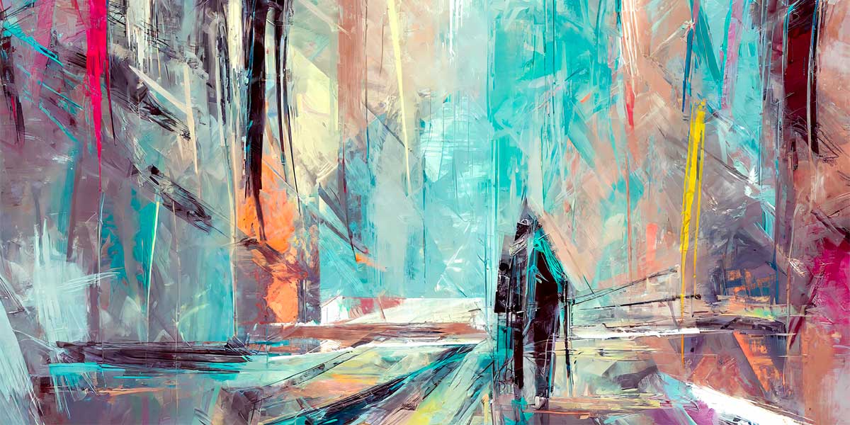 Farverne består primært af lyse toner som perlehvid, elfenbenshvid og lys cementgrå, der danner en rolig baggrund for de mere markante farvefelter. Disse brydes af klare accenter i turkisblå, akvamarin og petrolgrøn, som tilfører dybde til motivet. Derudover ses stærke kontrastfarver i karminrød, citrongul og varm orange, som fremhæver de diagonale linjer og giver billedet et energisk udtryk.