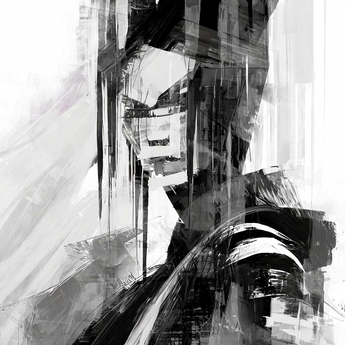 Sort hvid kunst plakat viser et abstrakt motiv opbygget af brede, buede penselstrøg og høje vertikale felter, der samler sig i en tæt komposition med tydelig rumlig dybde. De mørke former skærer sig gennem billedfladen som stiliserede konstruktioner eller tunnelagtige passager, mens de lyse områder åbner kompositionen og giver luft. Kombinationen af skarpe kanter, transparente lag og tunge sorte strøg giver værket en arkitektonisk og næsten industriel karakter.