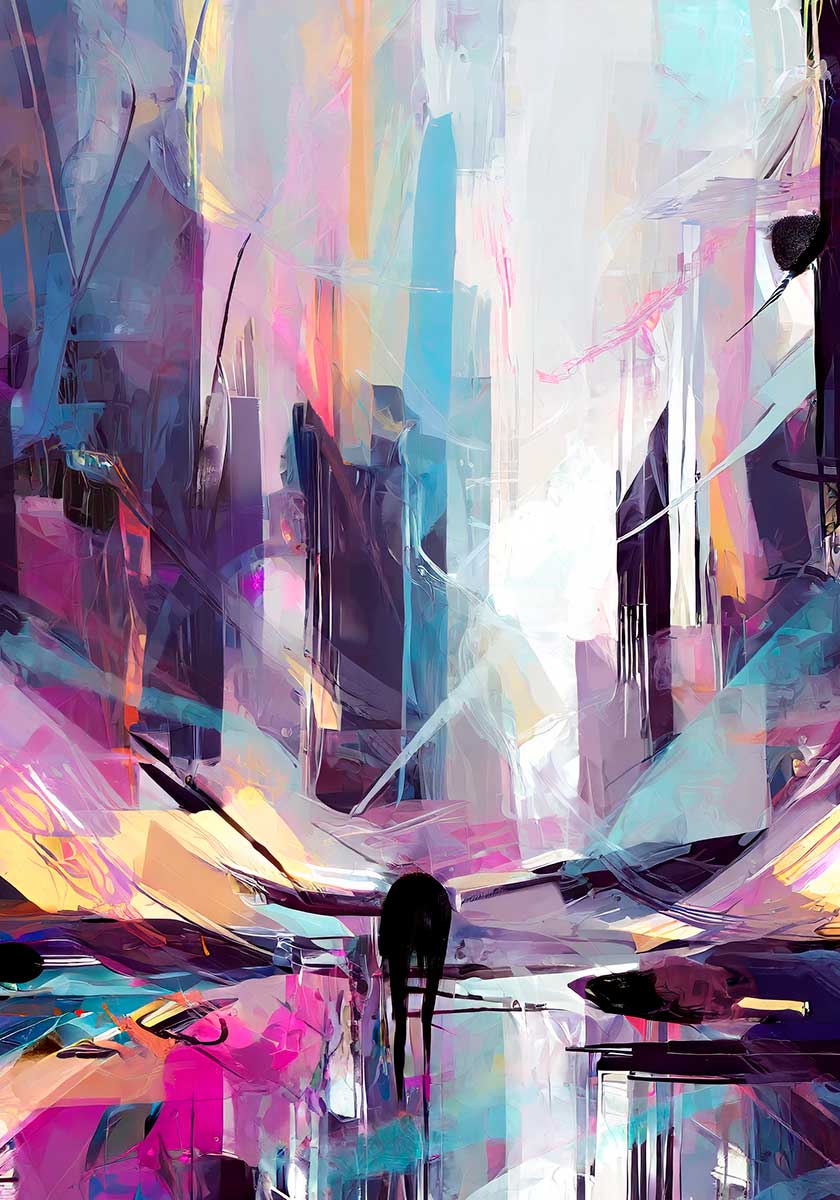 Stor plakat viser et abstrakt motiv opbygget af høje vertikale flader, spejlende bundpartier og en lys central åbning, der skaber en tydelig dybde i kompositionen. I nederste del står en mørk, næsten silhuetlignende form, som forankrer billedet og giver skala til de omkringliggende strukturer. De lange lodrette felter og de skrå forbindelser mellem dem får motivet til at ligne en stiliseret passage eller et byrum med reflekterende overflader.