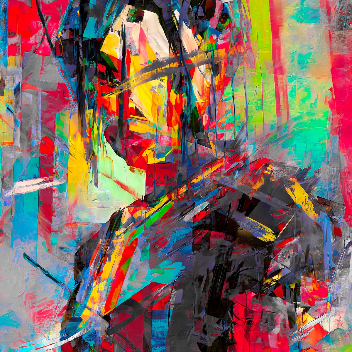 Farverne består af en intens palette med klare toner i signalrød, karminrød og magenta kombineret med citrongul og varm orange. De varme farver brydes af kølige nuancer i turkis, cyan og akvamarin, som giver motivet balance. Mørkere områder i grafitgrå og sort skaber kontrast og fremhæver de stærke farvefelter.
