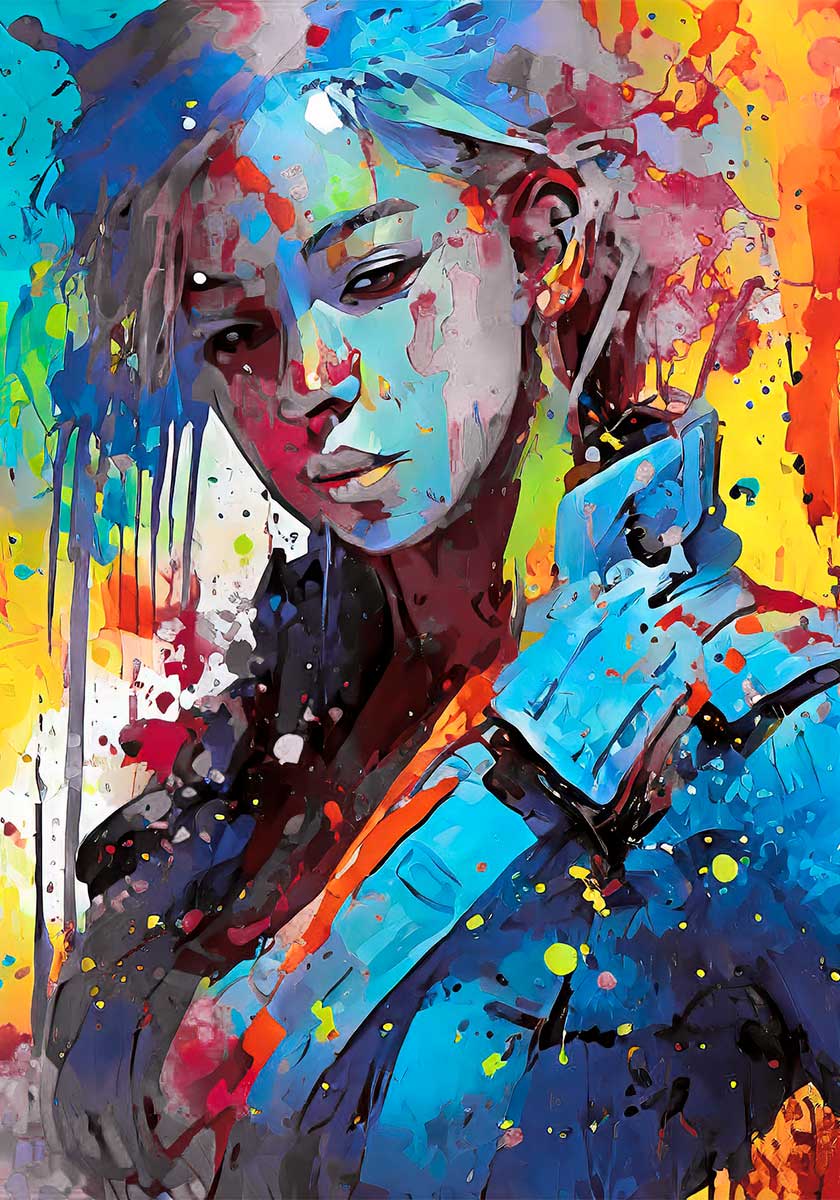 Farvepaletten består af varme nuancer i okkergul, citrongul og gylden gul, som står i kontrast til kølige toner i turkis, cyan og petrolblå. Derudover ses kraftige accenter i magenta, karminrød og violet, som giver motivet ekstra intensitet. Mørkere områder i grafitgrå og sort skaber balance og fremhæver de lysere farvefelter.