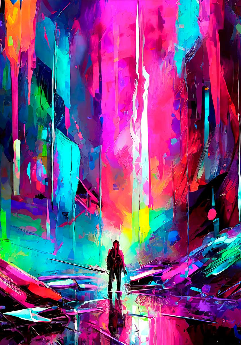 Plakat i stærke farver viser et vertikalt motiv opbygget af høje, næsten søjlelignende farvefelter, der rejser sig omkring en lille central figur i nederste del af kompositionen. De lodrette linjer brydes af skrå flader og spejlende refleksioner i bunden, som får motivet til at ligne en futuristisk passage eller en lysende bykløft. De lange dryppende strøg giver dybde, mens figurens placering i midten samler billedets retning.