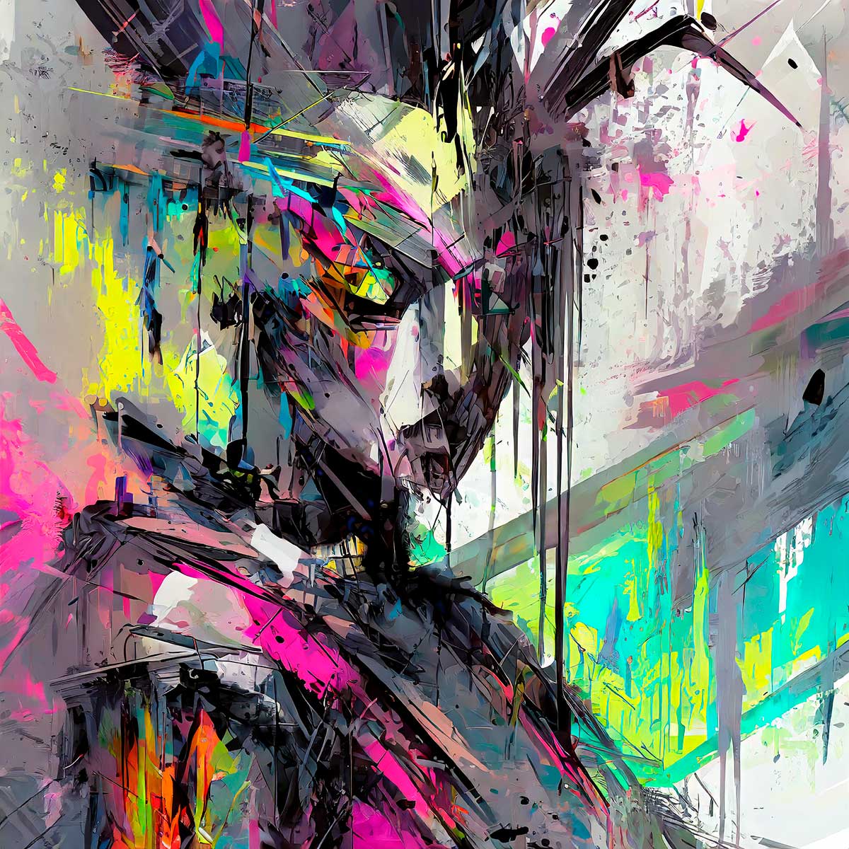 Farvepaletten er centreret omkring grafitsort, kulgrå og blæksort, som brydes af lysende felter i neonpink, citrongul, limegrøn og akvamarin. Små områder i koral, varm orange og kølig mintgrøn lægger ekstra kontrast i ansigt og baggrund. De stærke accentfarver ligger som markeringer mod de mørke flader, hvilket giver motivet et intenst og meget grafisk udtryk med tydelig kontrast mellem lys og mørke.