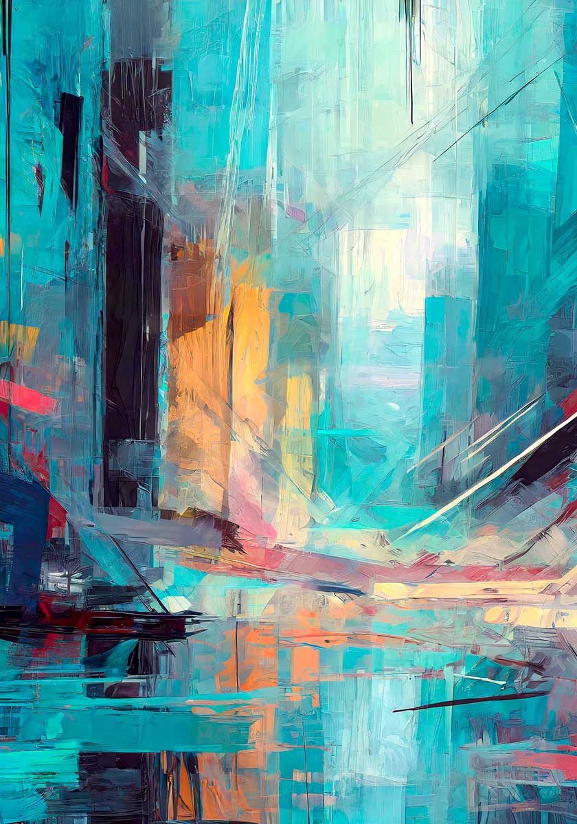 Farvepaletten domineres af akvamarin, turkis, lys cyan og isblå, som glider over i varme områder af abrikos, fersken og koralrosa. Mørke partier i aubergine, blommeviolet og dyb grafit ligger i siderne og fremhæver den lyse midte. Samspillet mellem de kølige blågrønne felter og de varme ferskenfarvede overgange giver motivet en balanceret, let og meget rumlig farvevirkning.