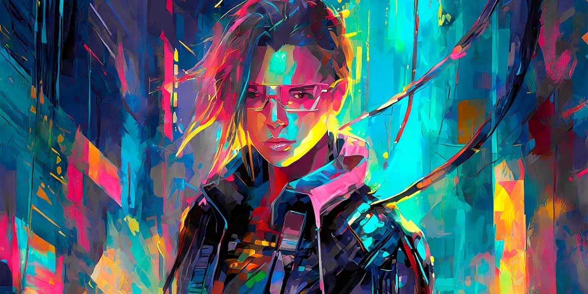 Farvepaletten består af kraftige toner i citrongul, varm okker og gylden gul kombineret med nuancer i magenta, fuchsia og rubinrød. Disse varme farver brydes af køligere områder i turkis, cyan og kongeblå, som skaber balance i motivet. Mørke felter i grafitsort og dyb antracit giver kontrast og fremhæver ansigtets former.
