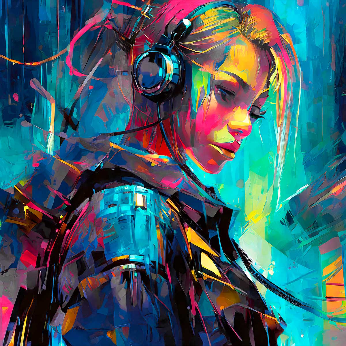Plakat med farver viser et figurativt motiv opbygget omkring et portræt i profil, hvor ansigt, hovedtelefoner og overkrop er sammensat af kantede farvefelter og skarpe grafiske linjer. De diagonale snit gennem jakken og hovedet skaber en teknisk og næsten futuristisk struktur, mens figurens let nedadgående blik giver motivet ro. Kombinationen af bløde ansigtsformer og hårde geometriske flader giver billedet en præcis og lagdelt opbygning.