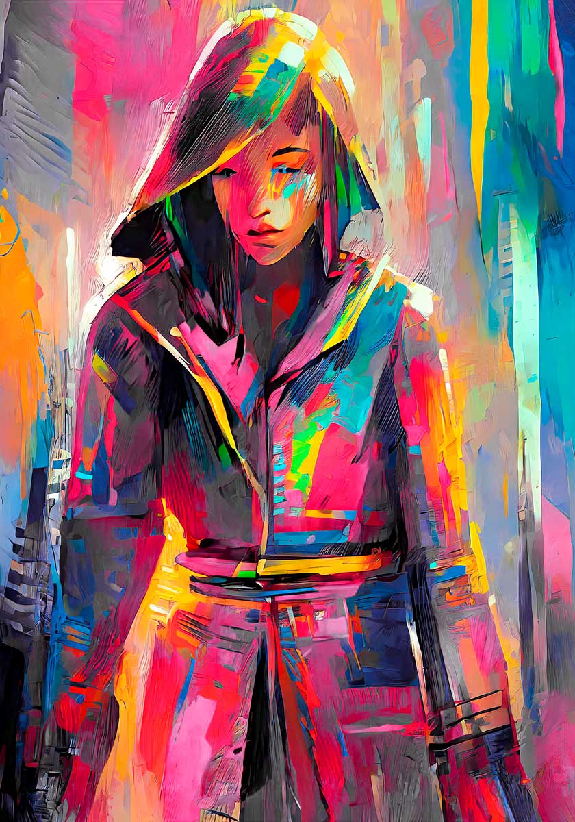 Kunst plakat farverig viser et figurativt motiv med en hætteklædt person, hvor ansigt og beklædning er opbygget af brede penselstrøg og skarpt afgrænsede farvefelter. Figuren står roligt og centralt, mens baggrunden opløses i vertikale strukturer og mere fragmenterede flader, som giver motivet en urban og næsten digital karakter. Kombinationen af det rolige portræt og den energiske baggrund skaber en tydelig spænding i kompositionen.